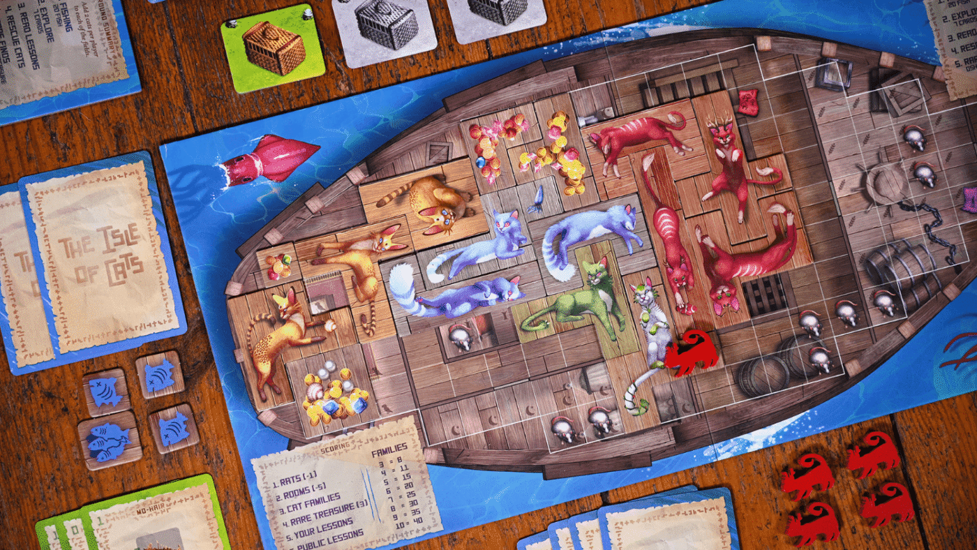 Explorez l’île, récupérez des trésors anciens et bien entendu sauvez un maximum de chats. Entreposez le tout sur votre rafiot avant de repartir pour l’Impasse des Miaulements. Placez les chats par famille autant que faire se peut, recouvrez les rats et les cartes Trésors et remplissez au mieux les cases de votre bateau et les objectifs des Traditions.