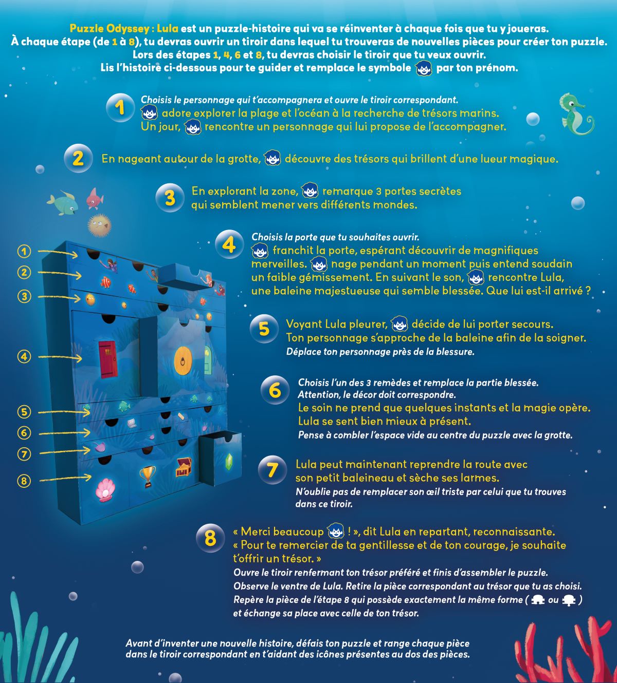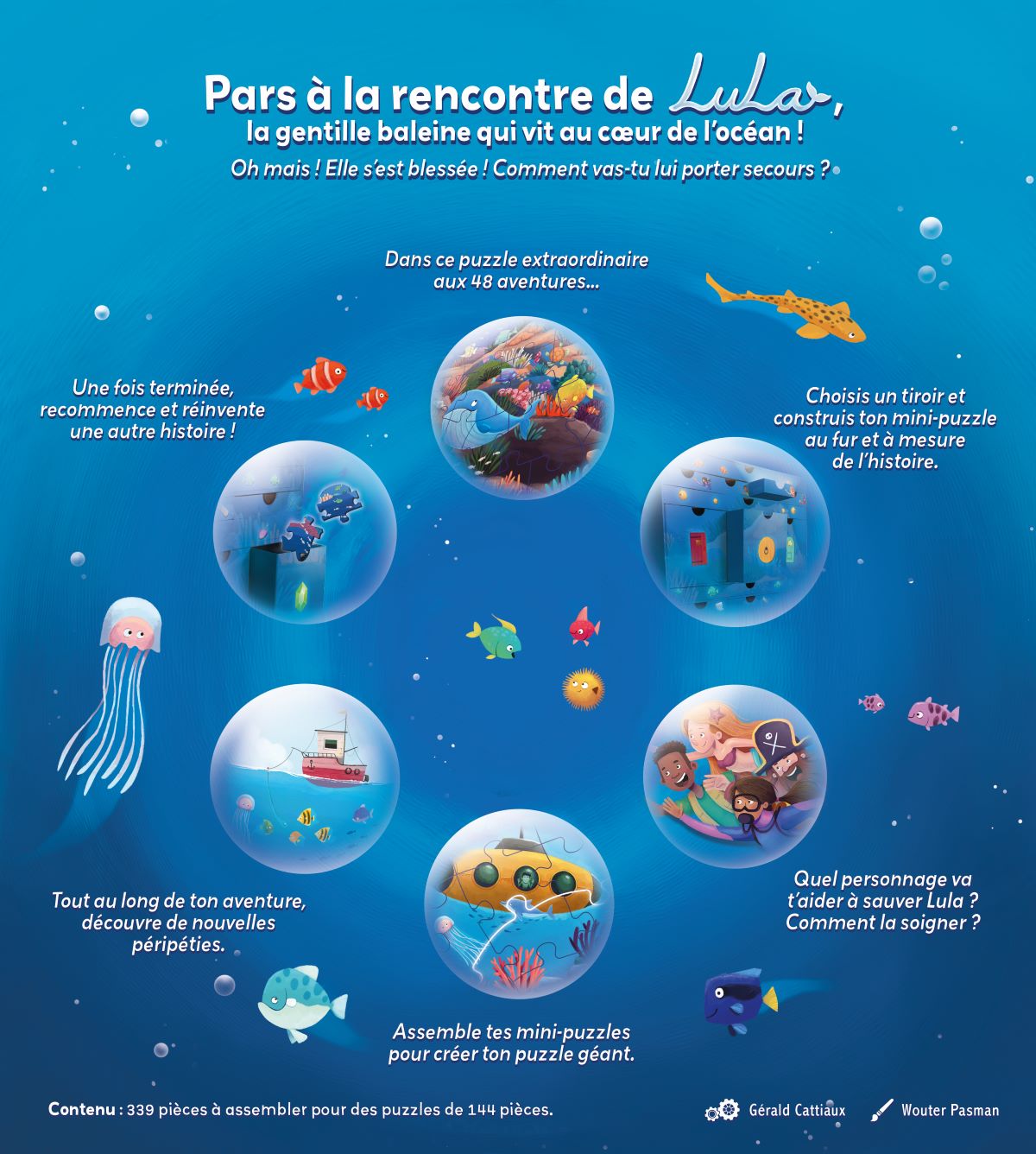 Plonge dans les profondeurs de l’océan pour sauver Lula, la baleine blessée ! Comment vas-tu lui venir en aide? Qui va t’aider à la soigner? A toi de construire ton puzzle en plusieurs étapes, de faire des choix tout au long de l’aventure et de découvrir de nouvelles histoires. Le Puzzle Odyssey « Lula » est un casse-tête de 144 pièces réparties dans 18 boîtes, qui évolue grâce à des mini-puzzles à assembler et à imbriquer les uns aux autres. Dans ce puzzle extraordinaire aux 48 histoires, choisis à chaque étape le tiroir que tu souhaites ouvrir et assemble les pièces pour découvrir la suite de ton histoire illustrée. Grâce à ton aide, Lula a grand espoir de pouvoir renager dans les profondeurs des eaux aux milles merveilles ! Des mini-puzzles qui racontent une grande histoire…