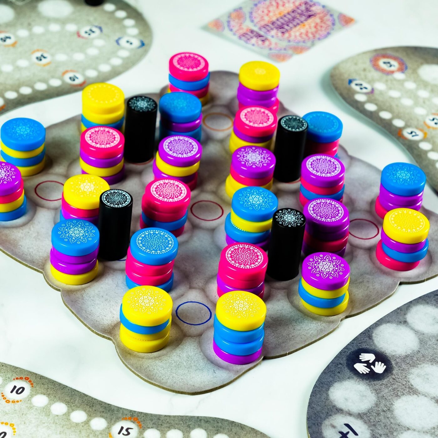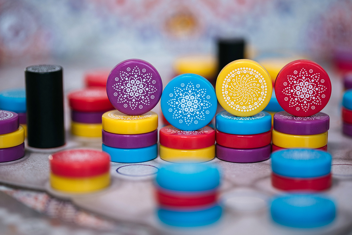 Pendant votre tour, vous pouvez soit piocher des pierres, soit “scorer” des pierres. Pour piocher, déplacez un artiste vers une nouvelle position, puis collectez les pierres adjacentes à cet artiste portant le même dessin que lui, et qui ne sont pas déjà adjacentes à un autre artiste. Choisissez l’un de ces pierres pour être la base de votre pile, puis empilez les autres pierres collectées sur cette fondation dans le sens horaire, et placez cette pile sur un espace vide de votre plateau personnel.