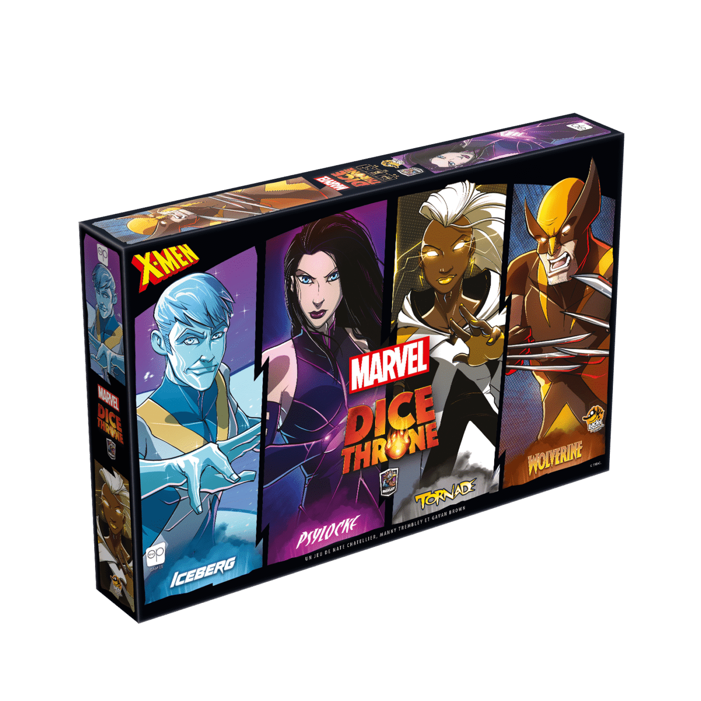 Marvel Dice Throne : X-Men est un jeu de combat rapide qui permet aux joueurs de se battre avec leurs héros X-Men préférés dans des duels en tête-à-tête, des batailles en équipe et des combats en mêlée générale ! Basé sur le succès retentissant de Dice Throne, ce coffret Marvel X-Men Dice Throne 4 Hero place les joueurs dans les rôles d'Iceman, Psylocke, Storm et Wolverine, chacun avec son propre jeu de dés, son plateau de jeu et son jeu de cartes unique. Attaquez vos adversaires et activez des capacités avec des lancers de dés, accumulez des points de combat et dépensez-les sur des cartes d'action qui permettent d'améliorer les capacités.
