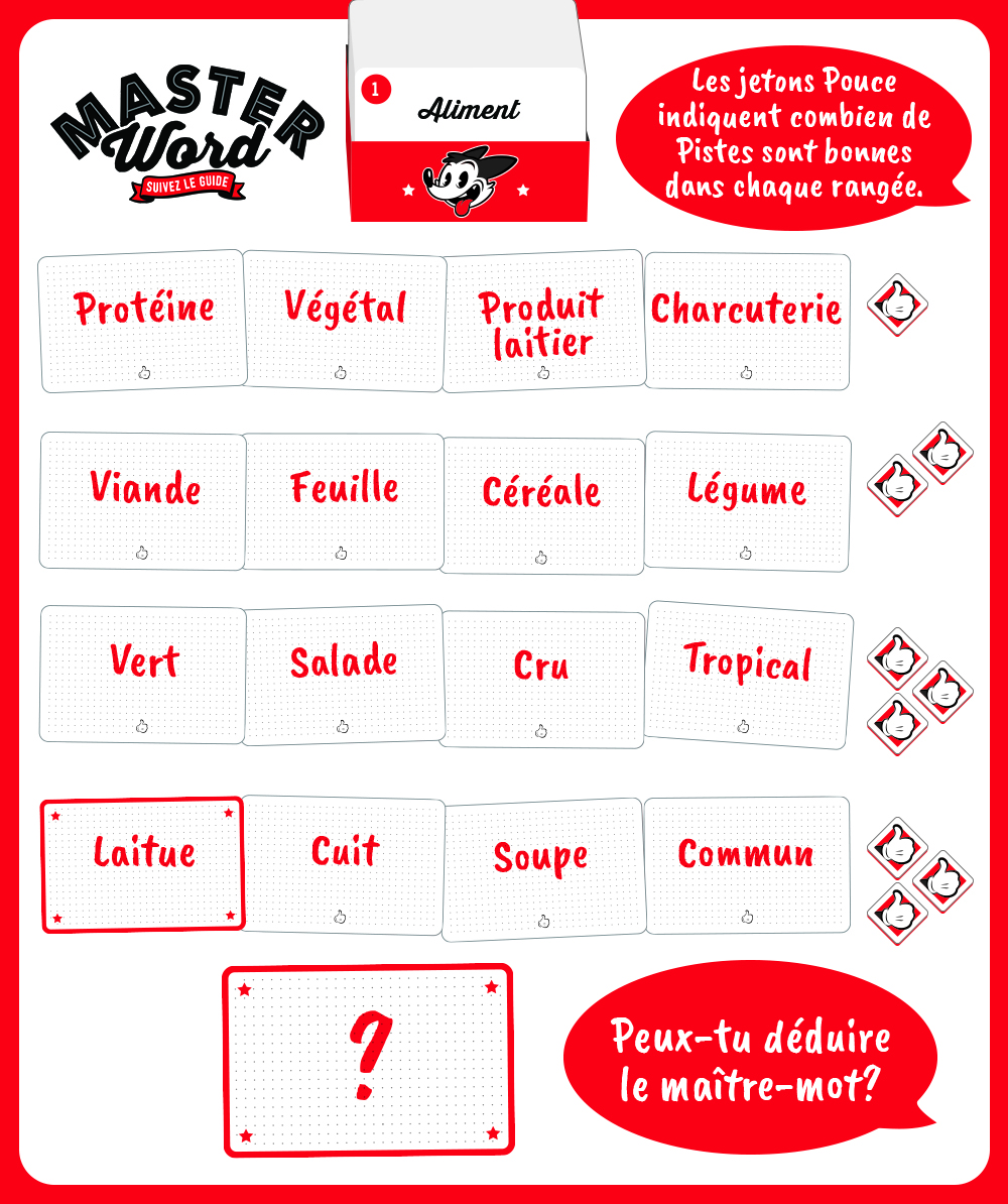 Master Word est un jeu entièrement coopératif. Discutez, déduisez, analysez et trouvez le maître-mot! Une équipe de chercheurs formule chaque manche une série de pistes pour trouver la nature du maître-mot. Le guide, qui connaît la réponse, peut uniquement indiquer combien sont bonnes, sans dire lesquelles! Un jeu hautement interactif, malin, rapide, addictif.