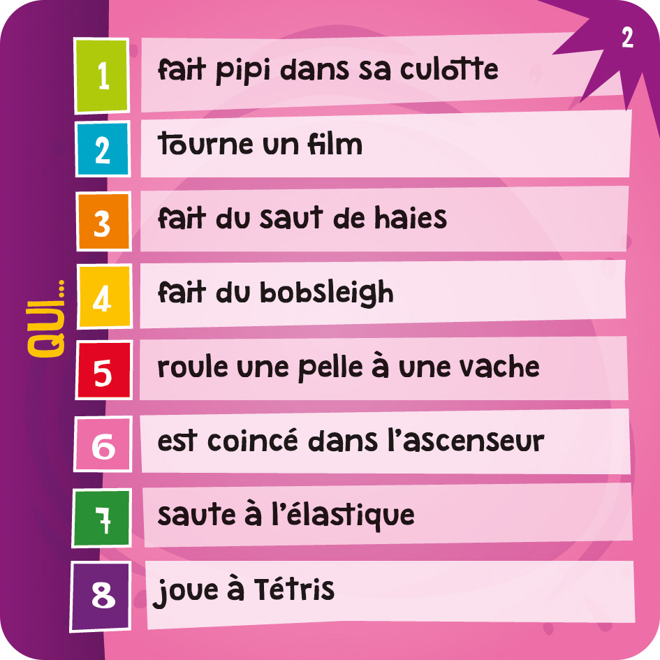 Deux équipes, deux pioches de cartes… et c’est parti! Votre objectif : avoir cumulé plus de points que l’équipe adverse lorsque les deux talons seront épuisés. À chaque tour, vous devrez mimer à vos partenaires des scènes très insolites, après avoir tiré une carte dans deux pioches différentes. La première carte vous indiquera le sujet (par exemple « un cheval ») et la seconde, l’action que ce dernier est en train d’effectuer (« fume un cigare » par exemple). Si vous parvenez à tout faire deviner à votre équipe avant la fin du sablier, vous marquerez les points indiqués sur les cartes!
