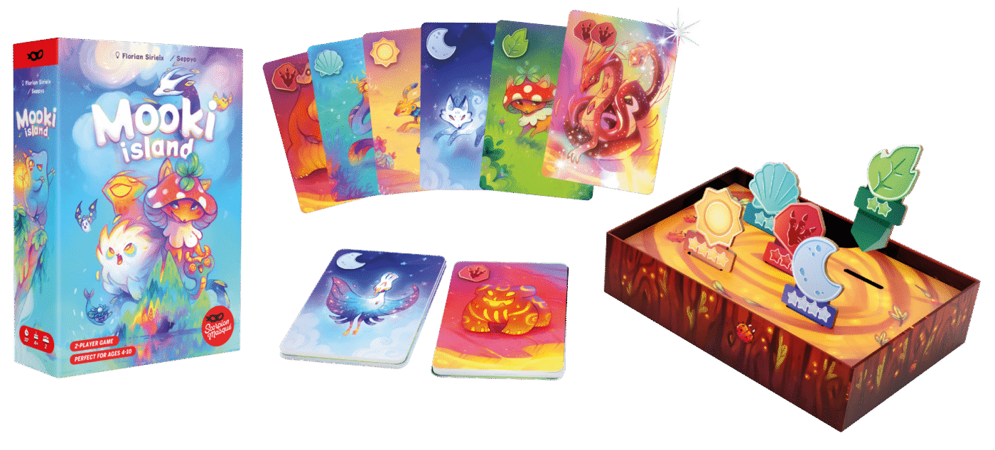 Mooki Island is a quick, engaging game for 2 players in which you’ll collect as many Mookies from each family as possible to win Trophies! Can you get the shiny Legendary Mookie cards? And above all: Watch out for that strange-looking Spider who’s just waiting to play a trick on you!