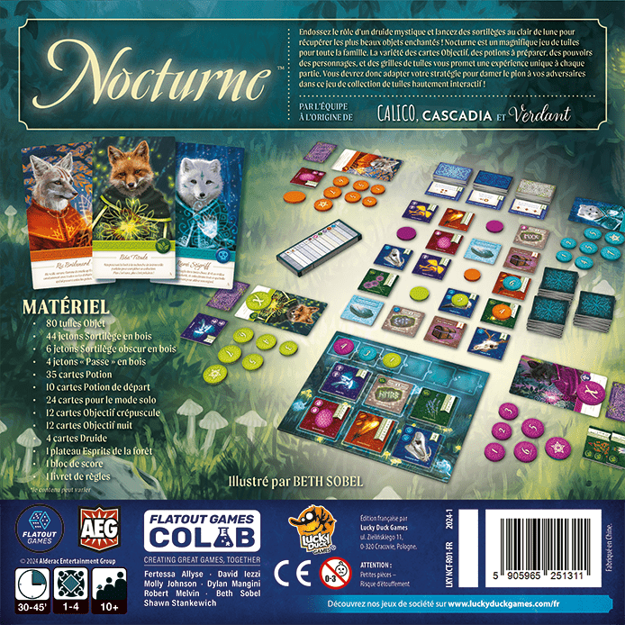 Dans Nocturne , vous incarnez un renard mystique qui lance des sorts magiques pour collecter un assortiment d'objets enchantés. Vous affrontez des mystiques rivaux, chacun d'entre vous décidant du moment où lancer les sorts les plus puissants pour se déplacer dans la forêt avec la plus grande ruse afin de sécuriser la meilleure collection. À chaque tour, vous décidez quels objets sont les plus précieux pour vous et quand retenir les autres mystiques.