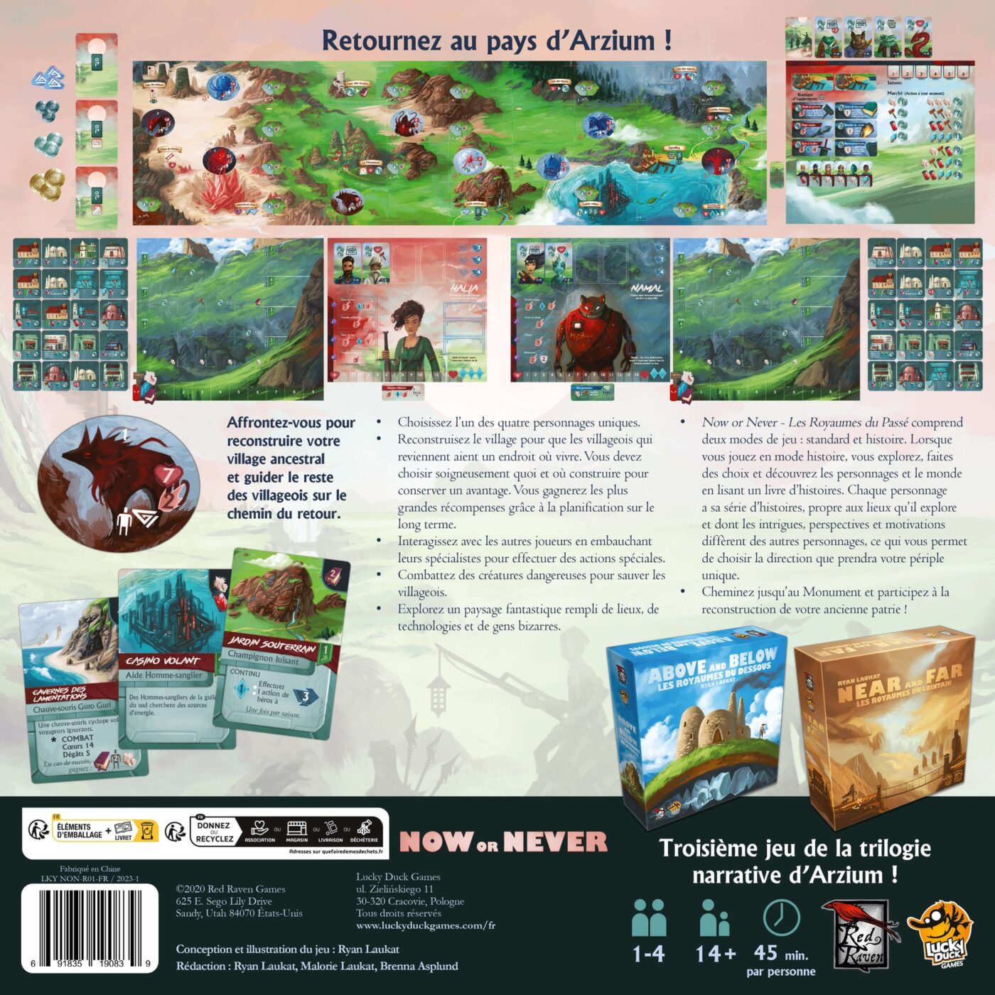 Après Above and Below et Near and Far, Now or Never - Les Royaumes du Passé vient clore la trilogie narrative d’Arzium. Plongez dans de nouvelles aventures en explorant des lieux extraordinaires où vous croiserez des peuples singuliers et de dangereuses créatures, dont il faudra protéger les villageois. Dans la peau de personnages uniques, affrontez-vous pour reconstruire votre village ancestral et guider les villageois sur le chemin du retour.