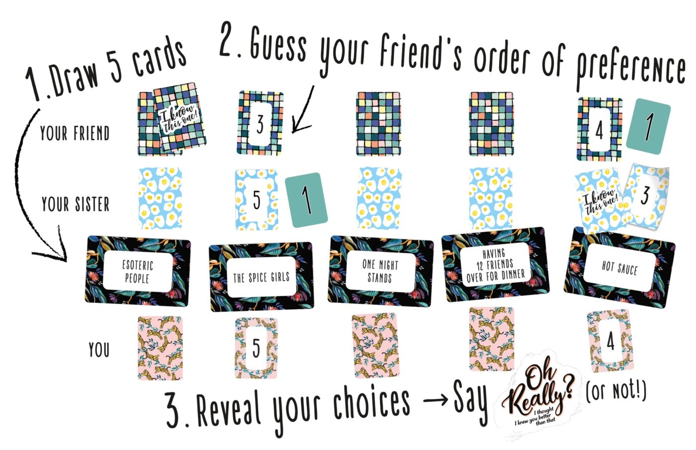 In Oh Really?, players try to correctly guess the order of preference of other players among 5 completely different topics. The more accurately your guesses are, the more points you score.