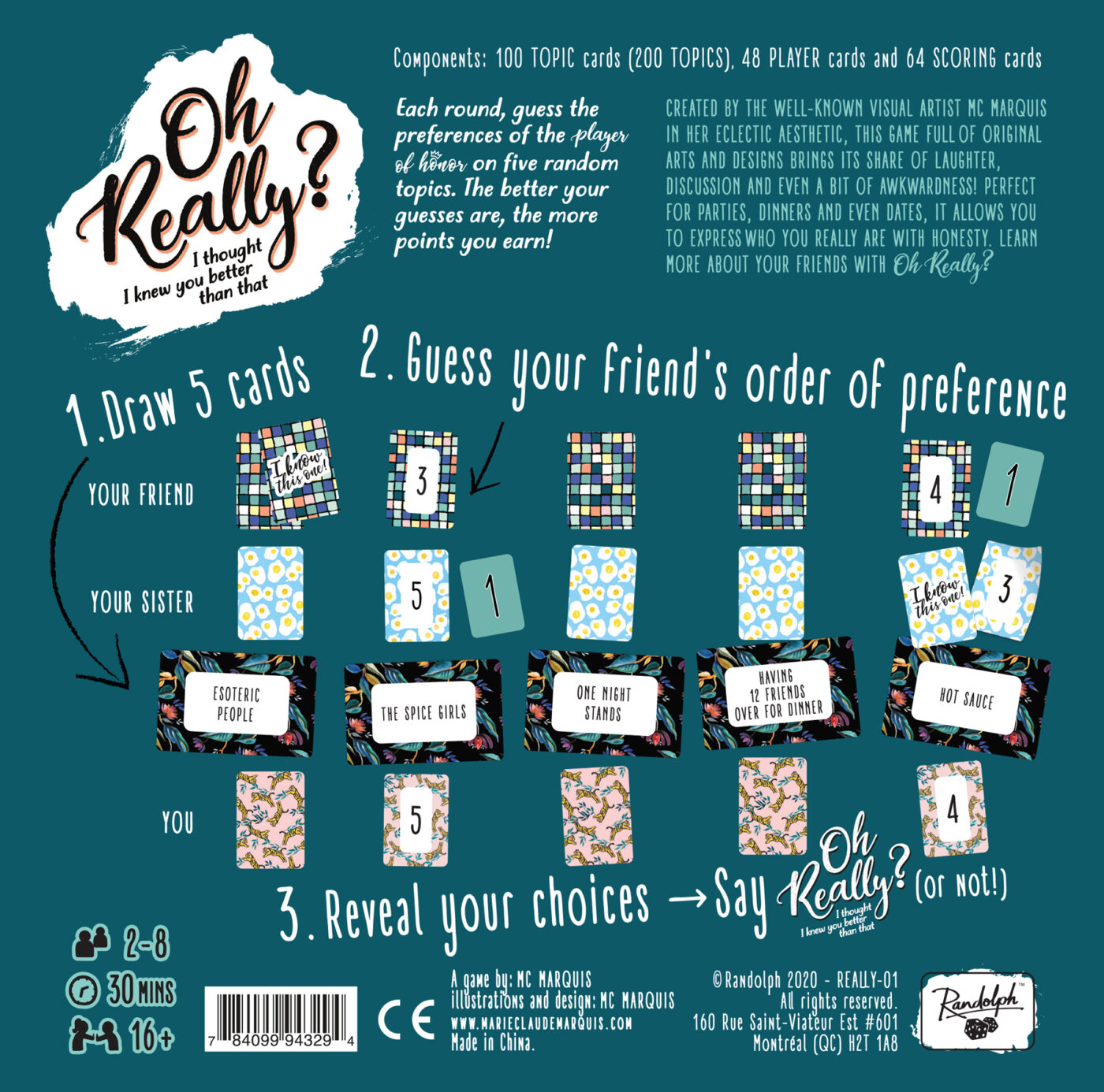 Oh Really? brings laughter, discussions and small discomforts, all of which can be a great icebreaker for your dinners, parties or even on a date! With 200 different topics to choose from, each game will be unique and each choices can be hard to make.