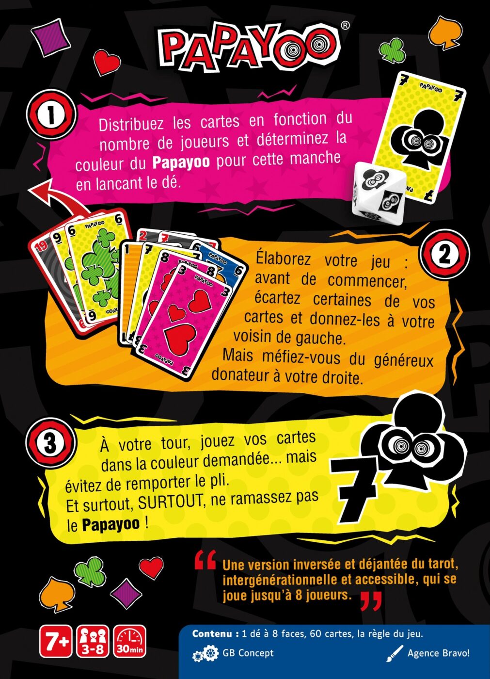 Dans Papayoo, les cartes ont de drôles d’atouts… et surtout, vous ne voulez PAS les gagner ! Dans ce jeu de plis complètement déjanté, cinq couleurs s’affrontent, mais une seule chose compte : éviter les points. Fuyez les Payoos, esquivez le redoutable Papayoo, ce maudit 7 dont la couleur change à chaque manche, et essayez de refiler le pire à vos adversaires.