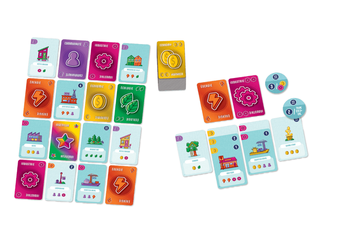 À chaque nouveau tour, choisissez 2 cartes qui peuvent être soit des ressources, soit des bâtiments. Gérez-les au mieux et utilisez les effets procurés par vos bâtiments pour créer votre ville et obtenir un maximum de points en fin de partie !