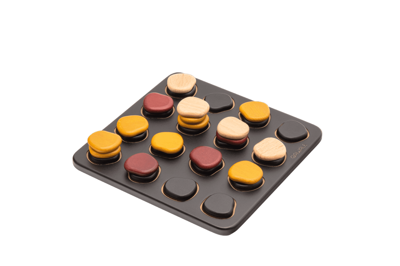 Simple et tactique à la fois, Qawale Mini trouve son inspiration dans les piles de galets que l'on trouve au bord des chemins. À l'image de ces pierres qui voyagent, placez un galet au sommet d'une pile avant de l'égrener sur les cases du plateau. Formez une ligne de 4 galets à votre couleur pour remporter la partie.
