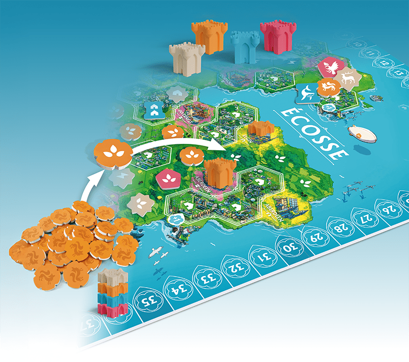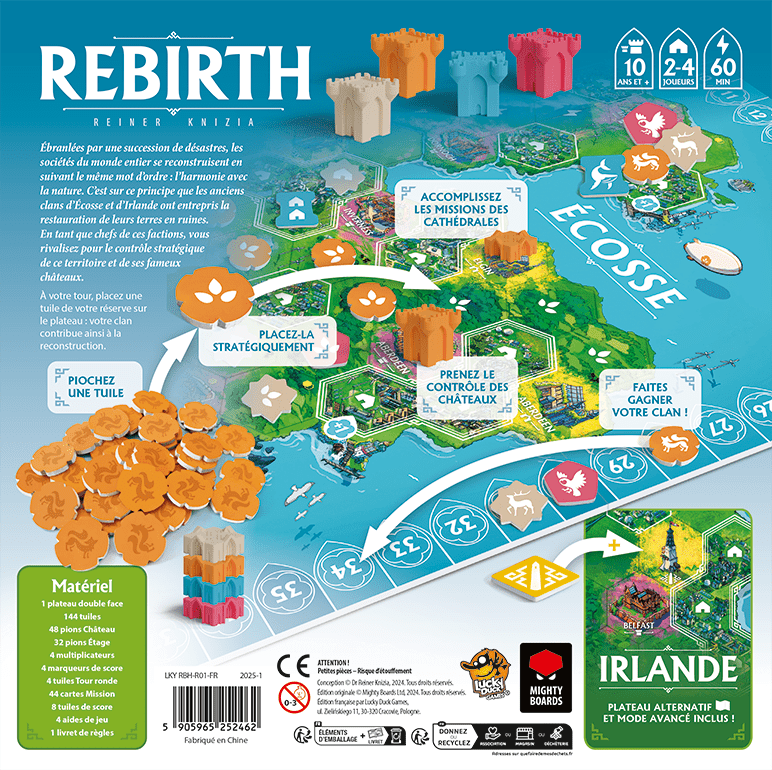 Après une série de calamités qui a laissé la civilisation en lambeaux, le temps est venu de reconstruire, en harmonie avec la Nature. En Ecosse ou en Irelande, en tant que chef de votre clans, faites les meilleurs choix pour rebâtir votre terre autour des prestigieux châteaux ! Avec un tour de jeux très simple, Rebirth vous propose des choix tactiques et stratégiques à chaque tour. Les 2 plateaux présentent leurs propres défis ! Des fermes énergétiques aux villes à rebâtir, laissez votre marque dans notre futur !
