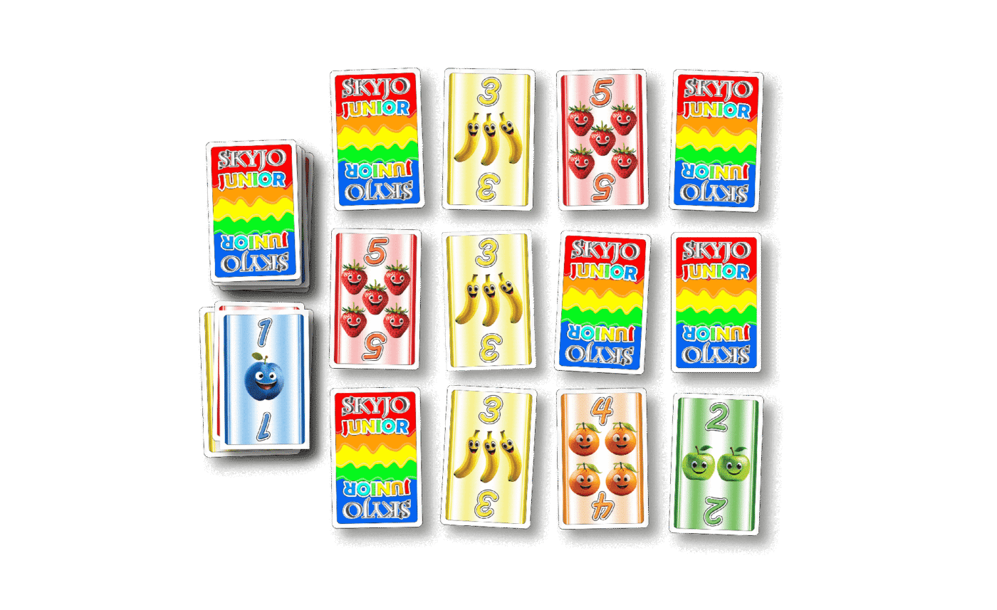 Skyjo Junior initie les enfants au jeu de cartes tout en douceur, avec des fruits rigolos, des chiffres de 1 à 5, et des mécaniques accessibles. Parfait pour apprendre à compter, observer et faire des choix — tout en s’amusant avec les grands !