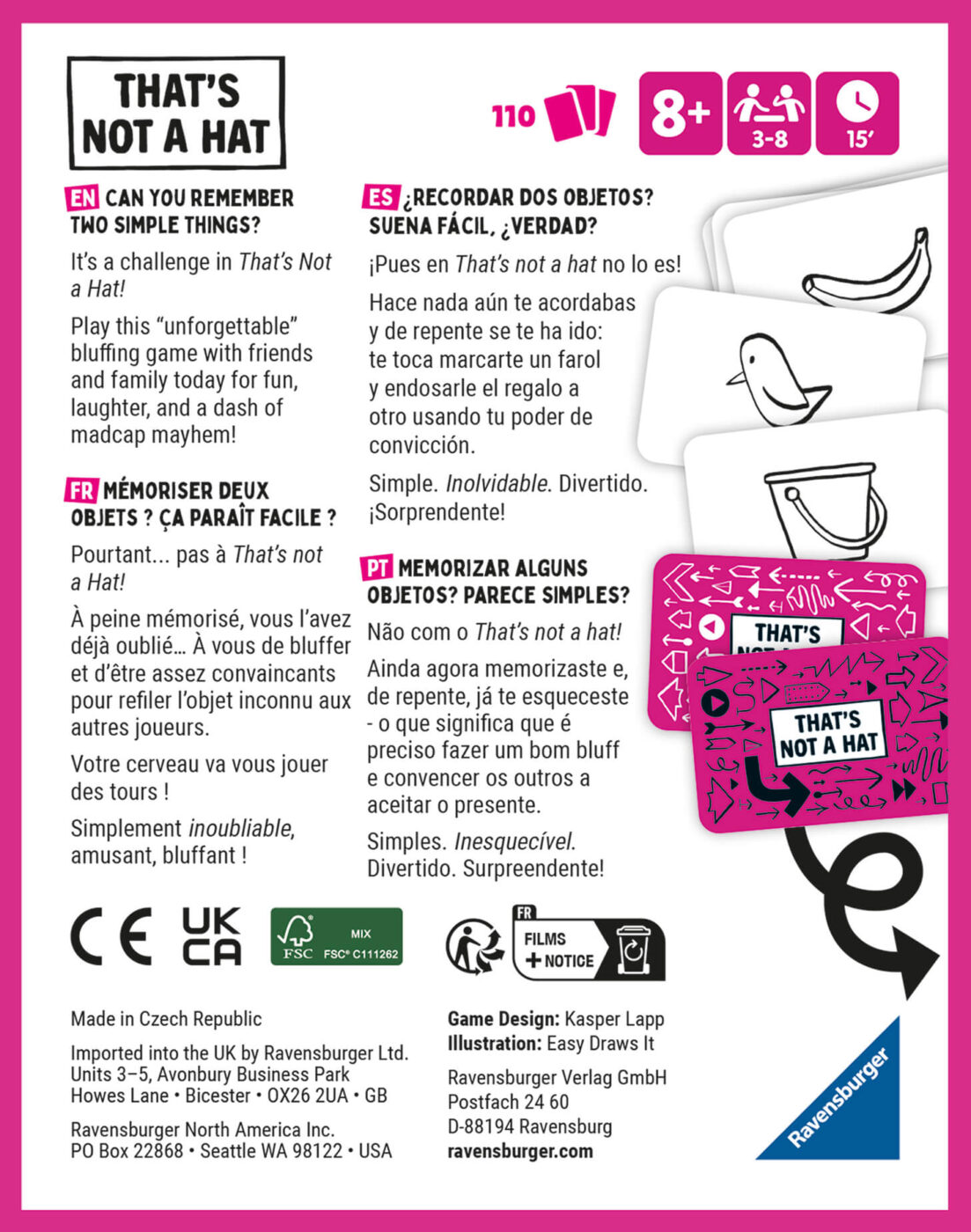 • Des règles simples et un emballage compact facilitent le jeu n'importe où et n'importe quand. Apportez Ce n'est pas un chapeau à votre prochain rassemblement!