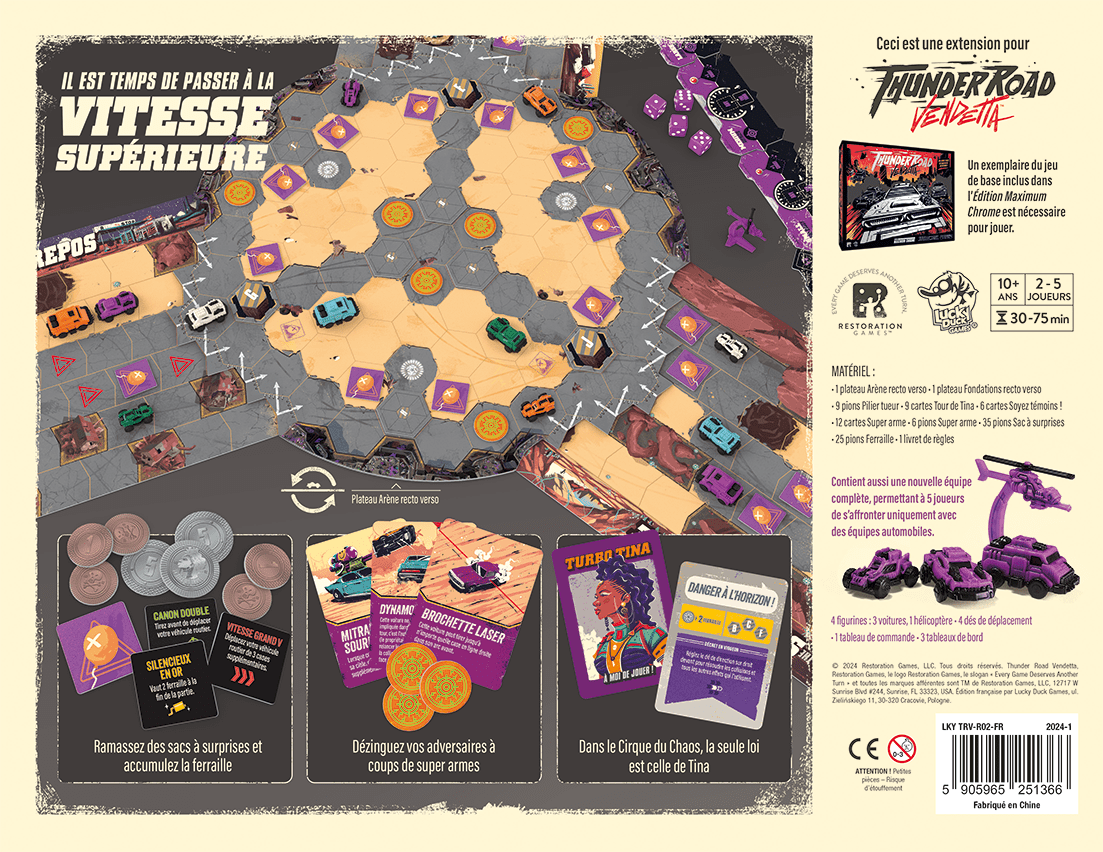 Le Cirque du Chaos est une extension qui offre une nouvelle façon de jouer. Cette fois, les joueurs roule dans une arène, collectant de puissantes armes et autres éléments customs en cours de route. Cette extension comprend également un ensemble complet de véhicules et un tableau de bord, ce qui vous permet de jouer avec un cinquième joueur... Et cette fois-ci, il n’y a pas de ligne d’arrivée !