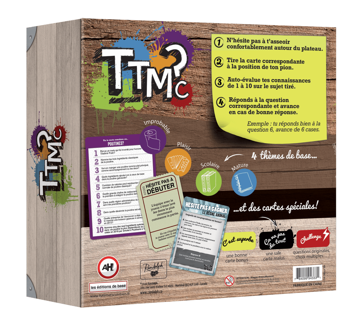TTMC, c’est un jeu questionnaire pas comme les autres : tu t’autoévalues de 1 à 10 selon ton niveau de connaissance sur un thème donné. Plus tu te « mets haut », plus la question est difficile… mais plus tu avances sur le plateau si tu as raison !