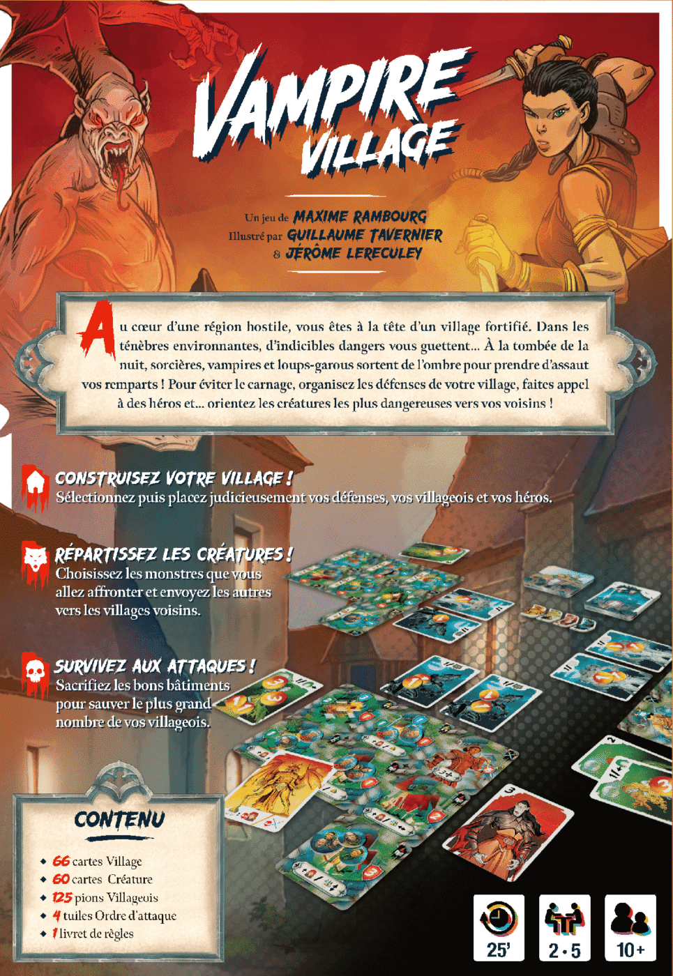 Une partie de Vampire Village se joue en 2 Manches durant lesquelles chaque joueur sélectionne des cartes pour construire son Village, puis répartit des cartes Créature entre lui et ses voisins. À la fin de chaque Manche, les Créatures attaquent et détruisent les Bâtiments et les Villageois les plus exposés. À l’issue des 2 Manches, le joueur qui possède le plus de Villageois et de Créatures maîtrisées est déclaré vainqueur.