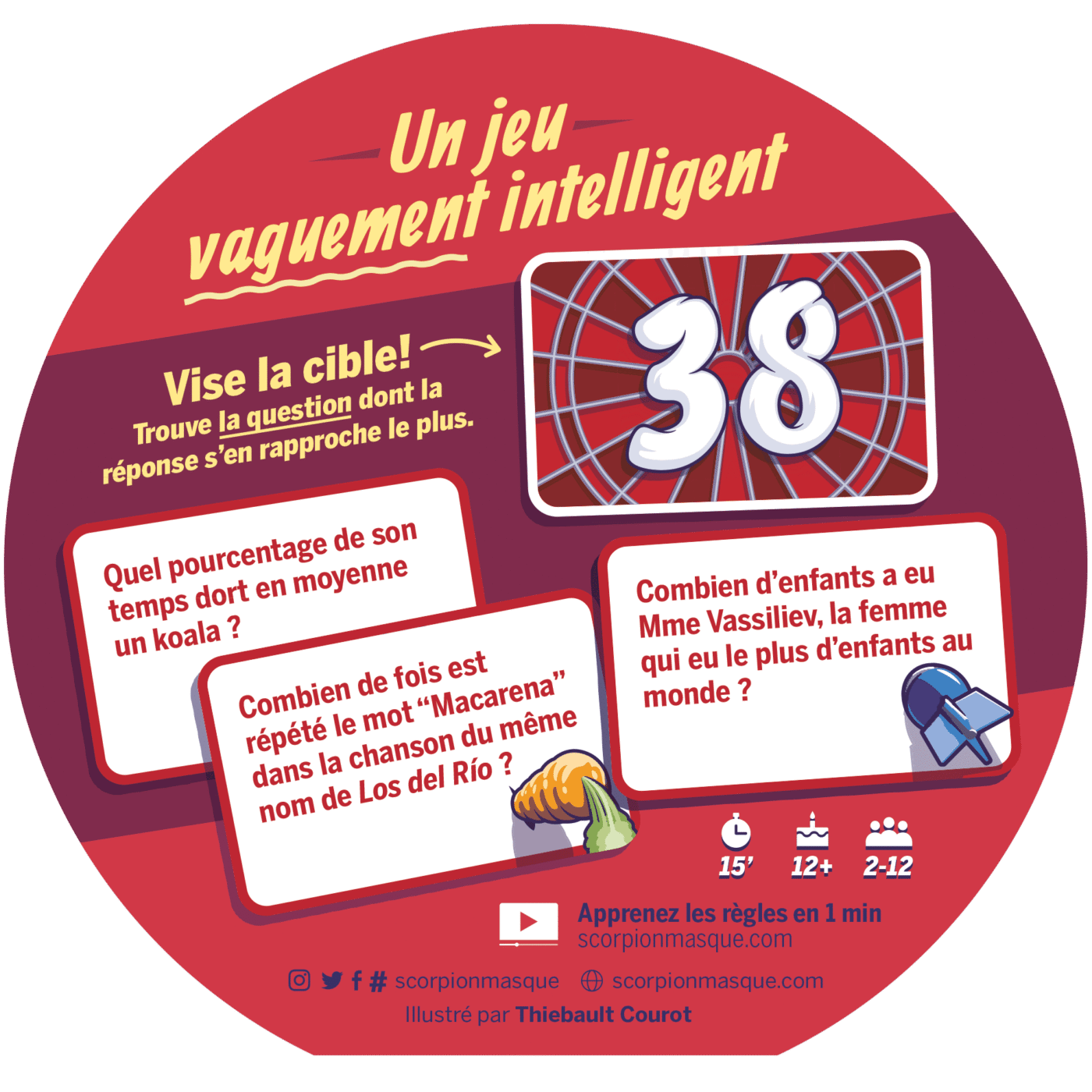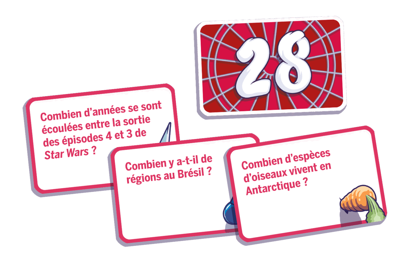 Pour gagner, soyez la première équipe à qui il ne reste qu’une seule carte. Pour vous débarrasser de vos cartes, discutez avec votre équipe pour trouver laquelle de vos cartes Question comporte la réponse la plus proche de la cible. S’il faut viser 68, jouerez-vous “Combien d’épisodes compte la série Game of Thrones” ou “Quel pourcentage de son temps dort un koala?”