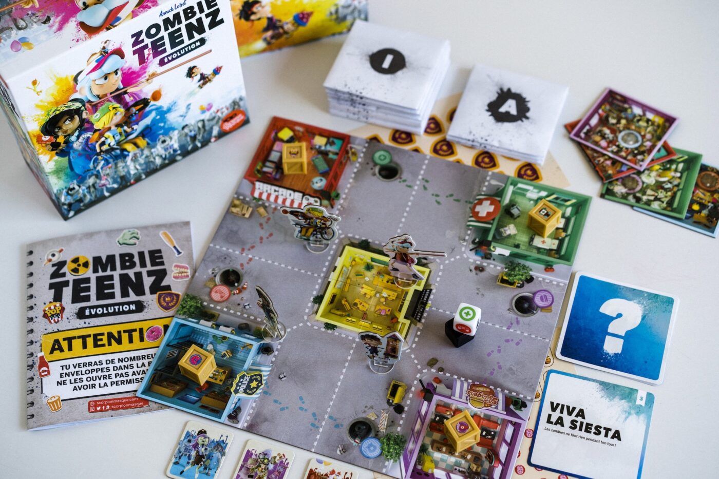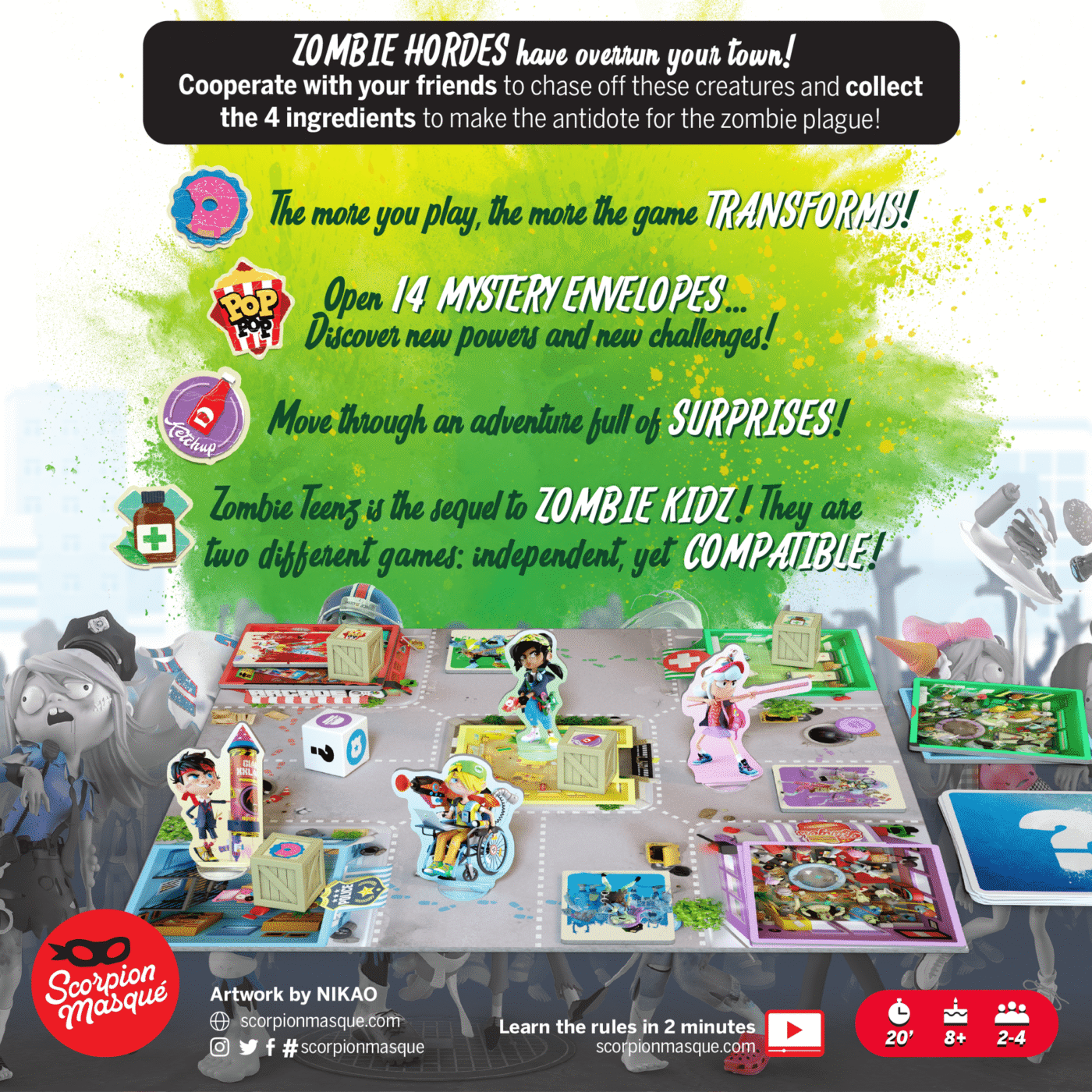 Zombie Teenz Evolution follows the same general guidelines as its predecessor: a fast and simple game whose rules evolve from game to game through the opening of 14 « »mystery » » envelopes. By accomplishing special missions, players unlock additional content that will provide a richer experience, while constantly renewing the enjoyment of the game. The icing on the cake: the two games are compatible! You will be able to play Zombie Kidz with your Zombie Teenz, and vice versa!