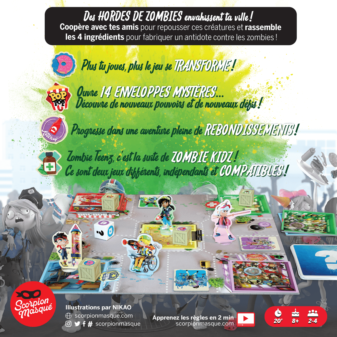 Les zombies envahissent maintenant toute la ville ! Dans Zombie Teenz Évolution, coopérez pour récupérer les 4 ingrédients nécessaires à l’antidote avant que le chaos ne s’installe. Chassez les zombies, défendez les bâtiments, ouvrez des enveloppes et regardez votre jeu évoluer au fil des parties. Une expérience familiale dynamique et pleine de surprises !